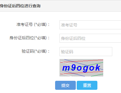 請輸入準考證號及身份證后四位進行查詢 準考證號 (*必填):準考證號身份證后四位(*必填):
