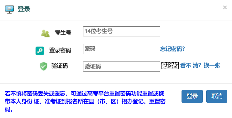 若不慎將密碼丟失或遺忘,可通過(guò)高考平臺(tái)重置密碼功能重置或攜帶本人身份 證、準(zhǔn)考證到報(bào)名所在縣(市、區(qū))招辦登記、重置密碼。