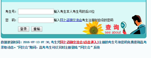 數(shù)據(jù)更新時間 考生憑網(wǎng)上咨詢交流會(點擊進(jìn)入)注冊的考生號和密碼免費(fèi)查詢高考錄取動態(tài)。"網(wǎng)交會"期間,高考考生可以實時注冊登陸“網(wǎng)交會”系統(tǒng)